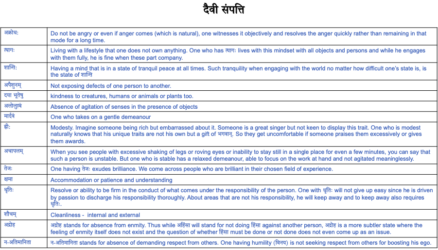 In chapter 16, श्रीमदभगवद्गीता also lists the personal attributes that one must possess. श्रीकृष्ण says that one who possesses दैवी सम्पत्ति will certainly be fit to gain higher knowledge. One must therefore strive to cultivate such attributes by working to attain them throughout one’s life.