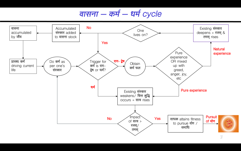 4:16/18 (2) – Some practical examples. So if a child is asked by the mother to fetch veggies from a shop, if the child executes it as a duty, since there is no कर्तृत्व & काम nor is he bothered about फल; no कर्म accrues to him and this activity of fetching is not कर्म (since he is performing this activity as an agent of her mother). On the other hand, if the wife is unwell and husband cooks food to help his wife, he has कर्तृत्व if he is doing the job to help his wife instead of thinking of this as his duty. Further, if he longs for praise from his wife for being a helping husband, there is काम. कर्म accrues as an outcome to such a person even through his activity is well-intended. If compassion drives one to give दान, there is कर्तृत्व when one has a feeling of helping another. When one helps because the other deserves such a help and it is his duty to help, even if there is no compassion, no कर्म will accrue. Helping another is thus a good deed but may not be called as कर्मयोग. In office, if one cares a damn about power, bonus or promotion (absence of काम) and works in a role that is in tune with his स्वधर्म (absence of कर्तृत्व), no कर्म will accrue. But if the work is not स्वधर्म, i.e., a technocrat doing a politician job or a politician cutting grass taking orders from others, कर्म accrues even if there is no काम since any activity that is outside our innate स्वभाव is an exertion and thus has कर्तृत्वता. If the same technocrat however does an Advisor role within a political party or a politically-oriented person is heading the Grasscutter Association, they are doing स्वधर्म and thus no कर्म will accrue if there is no काम and फलत्याग. Equally, one may be at ease if they are engaged in स्वधर्म but end up being driven by काम (praise, bonus, etc), कर्म will accrue again and such कर्म is to be taken as action. One need to thus be very clear what is कर्म and what is not. Only if one is clear about these, one will be able to identify विकर्म (avoidable कर्म) and thus practice कर्मयोग. कर्मयोग practice is thus not possible unless a person possesses विवेक or clarity of thought.