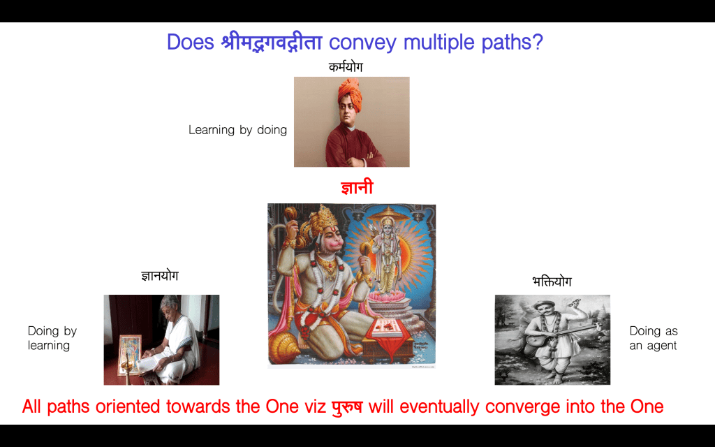 This approach is interesting since it does not say one branch is better than the other but actually suggests that one branch must lead to the another or else we are struck at previous level. So start with क्रिया like नित्यपूजा, जप, chanting, etc being simple practices. These pursued over a period of time must necessarily take us to a state where we question the reason behind these and as we investigate further, we can connect with their purpose and thus get ज्ञान of Oneness. This ज्ञान of Oneness excites us further and we intensify our efforts to focus on the truth of Oneness and these deeper efforts are nothing else but ध्यान. And once we achieve सिद्धि in ध्यान, we really start experiencing Oneness everywhere in the form described in chapter ten. At this stage, we fully lose the idea of doer-ship (कर्तृत्व भाव) as अहंकार breaks away from us. Once अहंकार goes away, we are at peace in the सत्-चित्-आनन्द state. People who are thus at various preliminary states are thus given a direction to tell them what their efforts must eventually lead to.