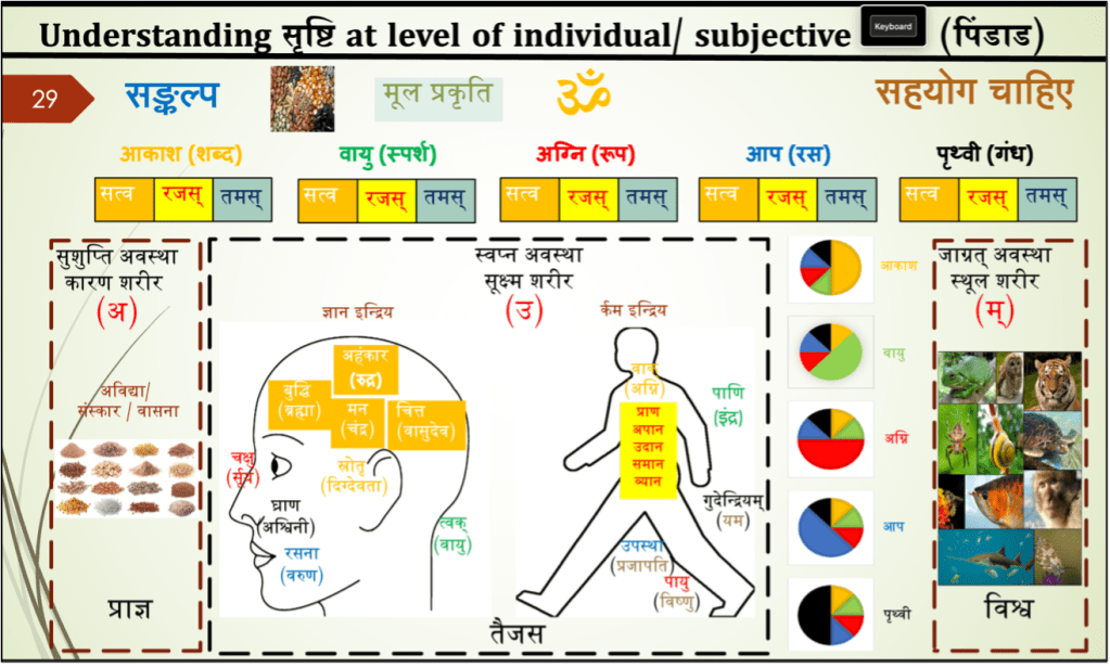 The root of the tree is ईश्वर Itself – and because it is transcendent, it is said that the root of the tree is upwards. Even in normal conversations, when we are in a situation when do not know anything about a certain topic, we look up for inspiration – why look up? Ideas from inspiration are up above!!!!! Up above is the space which is the most सूक्ष्म पदार्थ within प्रकृति. And ईश्वर is more सूक्ष्म than प्रकृति. And from most सूक्ष्म state of being only, स्थूल (the physicality) came about – similarly, from that which cannot be seen, that which is unknown, that which is transcendental, the world has come about. Hence, the root of the universe is shown as being upwards.