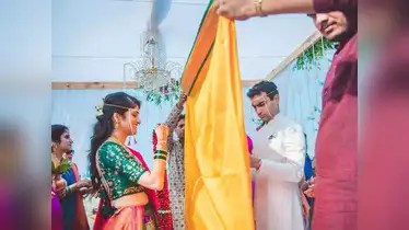 - After the मङ्गलाष्टक are narrated by the पुरोहित, the curtain/ screen between the bride and the groom is drawn away. The bride and the groom see each other and sprinkle the cumin-jaggery mixture on each other’s heads.